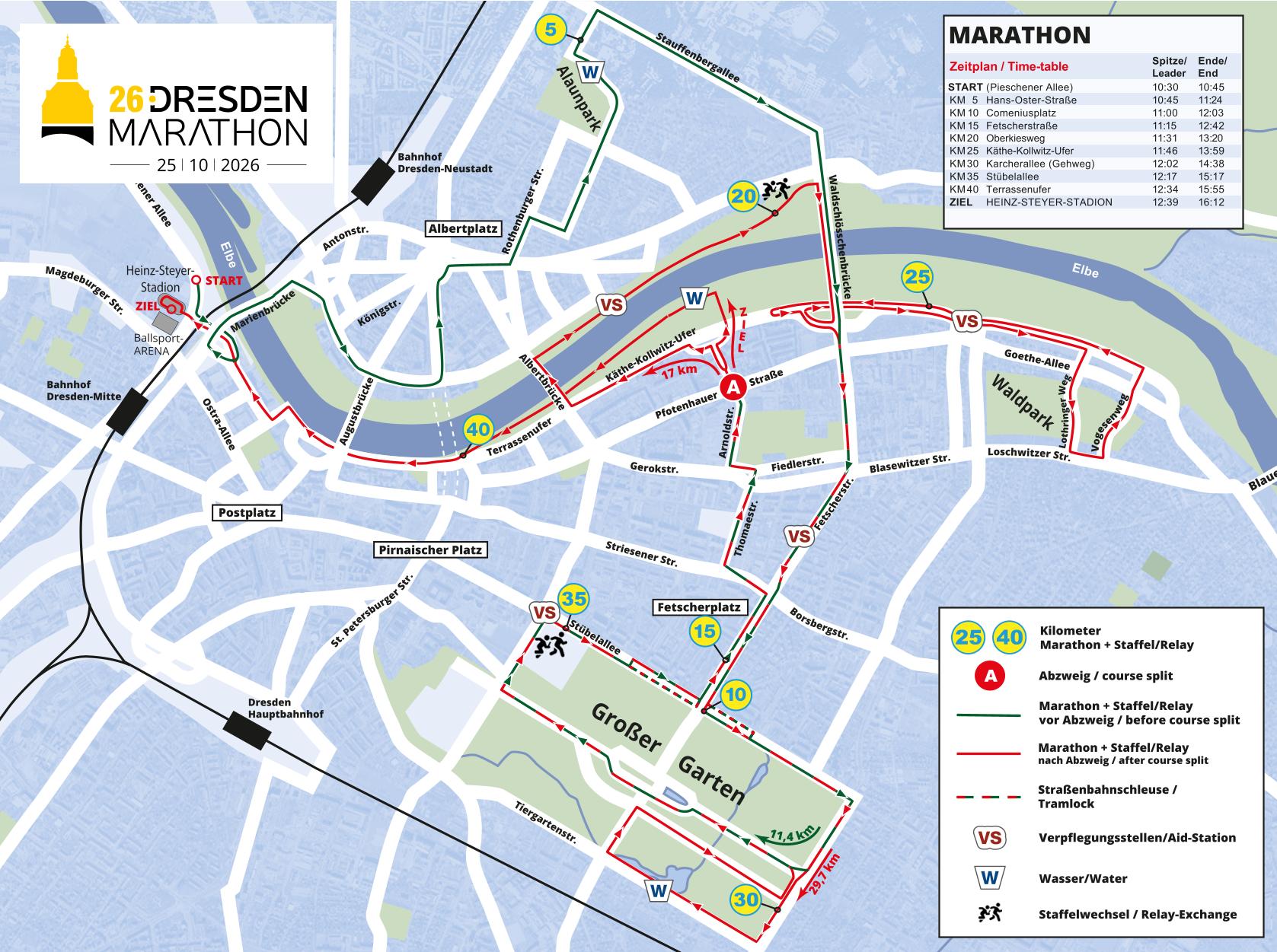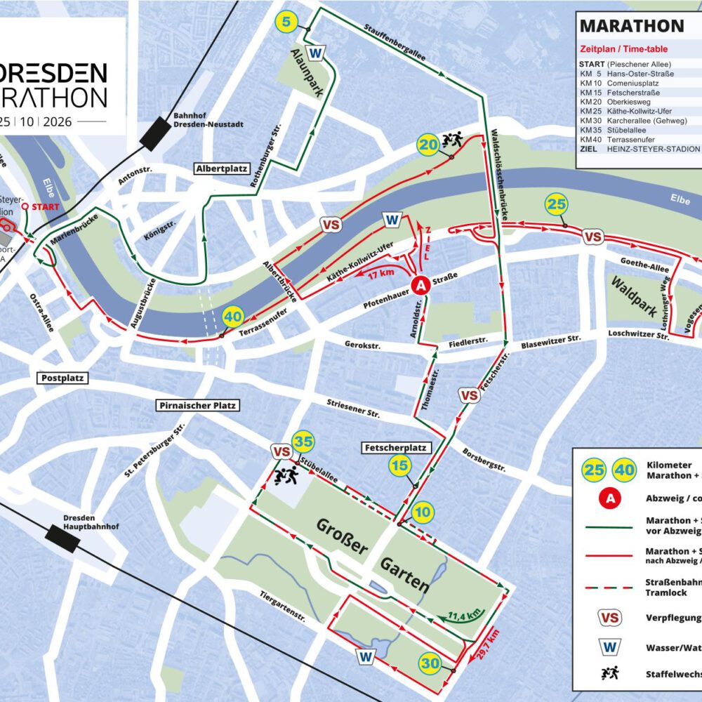 Das Start/Ziel Areal ist im Bereich Pieschener Allee/HEINZ-STEYER STADION, ca. 800m entfernt vom Dresdner Stadtzentrum (Zwinger, Semperoper).
