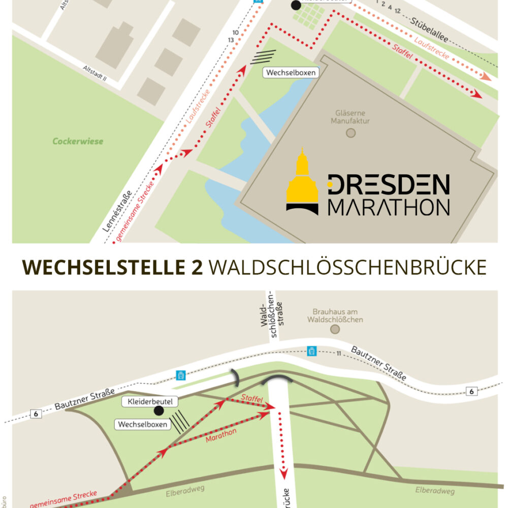 Der 2. Läufer muss – wie alle Marathonteilnehmer – bis 12:50 Uhr am Abzweig zum 2. Marathonteil (km 17, Ecke Arnoldstraße / Thomas-Müntzer-Platz) sein.